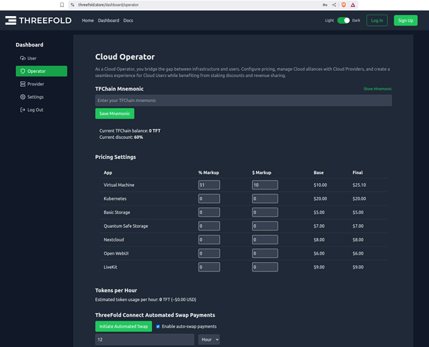 - Node Operators as Dashboard Operators: Hilbert, a Node Operator, can also run a dashboard, deploying apps on his own nodes. He pays TFChain’s base cost plus any dashboard margin but can apply a discount code to waive the extra for himself or partners.